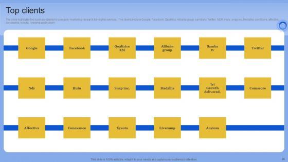 The slide highlights the business clients for company marketing research and insights services. The clients include Google, Facebook, Qualtrics, Alibaba group, samba tv, Twitter, NDR, Hulu, snap.inc, Medallia, comScore, affective, conexance, eyeota, liveramp and Acxiom Find a pre-designed and impeccable Top Clients Data Analytics Company Outline Pictures PDF The templates can ace your presentation without additional effort. You can download these easy-to-edit presentation templates to make your presentation stand out from others. So, what are you waiting for Download the template from Slidegeeks today and give a unique touch to your presentation. The slide highlights the business clients for company marketing research and insights services. The clients include Google, Facebook, Qualtrics, Alibaba group, samba tv, Twitter, NDR, Hulu, snap.inc, Medallia, comScore, affective, conexance, eyeota, liveramp and Acxiom