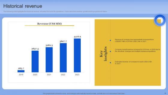 The following slide highlights the historical revenue of Kantar from all of its operations. It also describes revenue growth and its projection for future. This modern and well-arranged Historical Revenue Data Analytics Company Outline Information PDF provides lots of creative possibilities. It is very simple to customize and edit with the Powerpoint Software. Just drag and drop your pictures into the shapes. All facets of this template can be edited with Powerpoint, no extra software is necessary. Add your own material, put your images in the places assigned for them, adjust the colors, and then you can show your slides to the world, with an animated slide included. The following slide highlights the historical revenue of Kantar from all of its operations. It also describes revenue growth and its projection for future