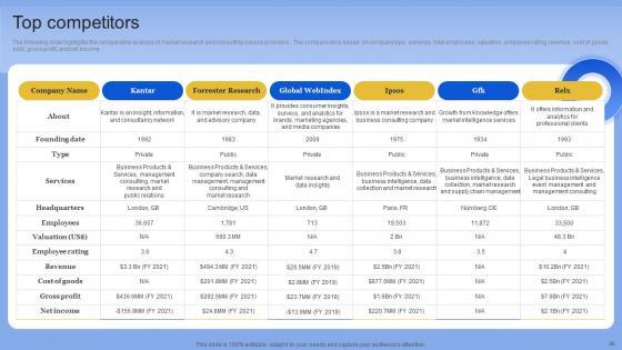 The following slide highlights the comparative analysis of market research and consulting service providers. The comparison is based on company type, services, total employees, valuation, employee rating, revenue, cost of goods sold, gross profit, and net income. Boost your pitch with our creative Top Competitors Data Analytics Company Outline Designs PDF Deliver an awe-inspiring pitch that will mesmerize everyone. Using these presentation templates you will surely catch everyones attention. You can browse the ppts collection on our website. We have researchers who are experts at creating the right content for the templates. So you do not have to invest time in any additional work. Just grab the template now and use them. The following slide highlights the comparative analysis of market research and consulting service providers. The comparison is based on company type, services, total employees, valuation, employee rating, revenue, cost of goods sold, gross profit, and net income