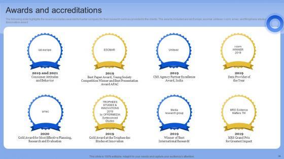 The following slide highlights the recent accolades awarded to Kantar company for their research services provided to the clients. The awards included are iab Europe, esomar, unilever, i-com, amec, and throphees etudes andinnovation award. Boost your pitch with our creative Awards And Accreditations Data Analytics Company Outline Guidelines PDF Deliver an awe-inspiring pitch that will mesmerize everyone. Using these presentation templates you will surely catch everyones attention. You can browse the ppts collection on our website. We have researchers who are experts at creating the right content for the templates. So you do not have to invest time in any additional work. Just grab the template now and use them. The following slide highlights the recent accolades awarded to Kantar company for their research services provided to the clients. The awards included are iab Europe, esomar, unilever, i-com, amec, and throphees etudes andinnovation award