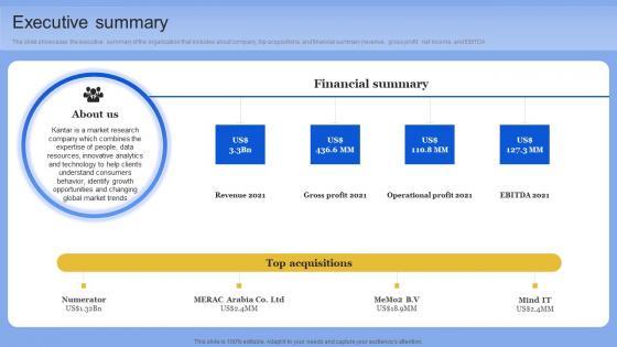 The slide showcases the executive summary of the organization that includes about company, top acquisitions, and financial summary revenue, gross profit, net income, and EBITDA. Do you have an important presentation coming up Are you looking for something that will make your presentation stand out from the rest Look no further than Executive Summary Data Analytics Company Outline Pictures PDF With our professional designs, you can trust that your presentation will pop and make delivering it a smooth process. And with Slidegeeks, you can trust that your presentation will be unique and memorable. So why wait Grab Executive Summary Data Analytics Company Outline Pictures PDF today and make your presentation stand out from the rest The slide showcases the executive summary of the organization that includes about company, top acquisitions, and financial summary revenue, gross profit, net income, and EBITDA