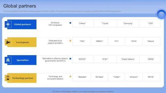 The slide highlights the international business partners for Kantar company. The partners included global partners, local giants, specialty partners and technology partners. Are you in need of a template that can accommodate all of your creative concepts This one is crafted professionally and can be altered to fit any style. Use it with Google Slides or PowerPoint. Include striking photographs, symbols, depictions, and other visuals. Fill, move around, or remove text boxes as desired. Test out color palettes and font mixtures. Edit and save your work, or work with colleagues. Download Global Partners Data Analytics Company Outline Graphics PDF and observe how to make your presentation outstanding. Give an impeccable presentation to your group and make your presentation unforgettable. The slide highlights the international business partners for Kantar company. The partners included global partners, local giants, specialty partners and technology partners