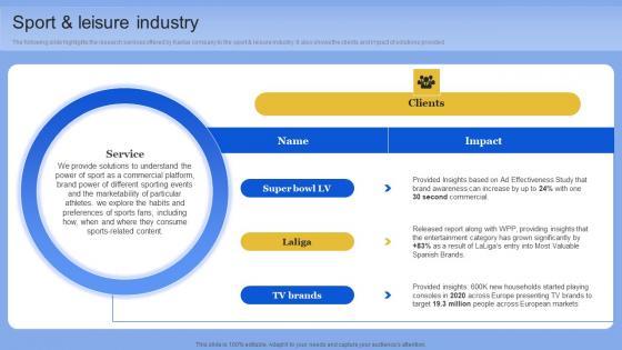 The following slide highlights the research services offered by Kantar company to the sport and leisure industry. It also shows the clients and impact of solutions provided. This Sport And Leisure Industry Data Analytics Company Outline Pictures PDF from Slidegeeks makes it easy to present information on your topic with precision. It provides customization options, so you can make changes to the colors, design, graphics, or any other component to create a unique layout. It is also available for immediate download, so you can begin using it right away. Slidegeeks has done good research to ensure that you have everything you need to make your presentation stand out. Make a name out there for a brilliant performance. The following slide highlights the research services offered by Kantar company to the sport and leisure industry. It also shows the clients and impact of solutions provided