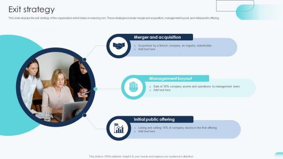 This slide displays the exit strategy of the organization which helps in reducing risk. These strategies include merger and acquisition, management buyout, and initial public offering. From laying roadmaps to briefing everything in detail, our templates are perfect for you. You can set the stage with your presentation slides. All you have to do is download these easy-to-edit and customizable templates. Exit Strategy Big Data Analytics Investor Funding Elevator Pitch Deck will help you deliver an outstanding performance that everyone would remember and praise you for. Do download this presentation today. This slide displays the exit strategy of the organization which helps in reducing risk. These strategies include merger and acquisition, management buyout, and initial public offering.
