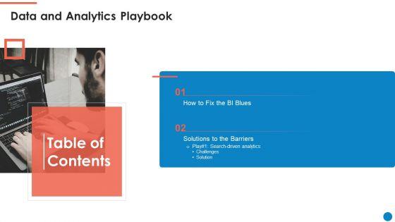 This is a Table Of Contents Data And Analytics Playbook Structure PDF template with various stages. Focus and dispense information on two stages using this creative set, that comes with editable features. It contains large content boxes to add your information on topics like Solutions Barriers, Challenges, Search Driven Analytics. You can also showcase facts, figures, and other relevant content using this PPT layout. Grab it now.