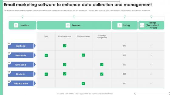 This slide presents a comparative analysis of email marketing software that enables customer data collection and data management. It includes features such as CRM, email verification, SMS automation, and campaign management. Pitch your topic with ease and precision using this Email Marketing Software To Enhance Data Collection And Management Ppt Icon Example File Pdf. This layout presents information on CRM, Email Verification, SMS Automation, Campaign Management. It is also available for immediate download and adjustment. So, changes can be made in the color, design, graphics or any other component to create a unique layout. This slide presents a comparative analysis of email marketing software that enables customer data collection and data management. It includes features such as CRM, email verification, SMS automation, and campaign management.