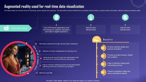 This slide provides an overview of the AR technology used to optimize the warehouse. The slide further includes benefits that are providing real-time details, accurate inventory information, effective training and enhance safety. Slidegeeks is one of the best resources for PowerPoint templates. You can download easily and regulate Augmented Reality Used For IoT Fleet Monitoring Ppt PowerPoint IoT SS V for your personal presentations from our wonderful collection. A few clicks is all it takes to discover and get the most relevant and appropriate templates. Use our Templates to add a unique zing and appeal to your presentation and meetings. All the slides are easy to edit and you can use them even for advertisement purposes. This slide provides an overview of the AR technology used to optimize the warehouse. The slide further includes benefits that are providing real-time details, accurate inventory information, effective training and enhance safety.