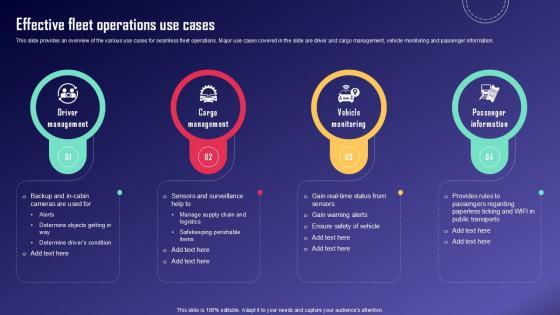 This slide provides an overview of the various use cases for seamless fleet operations. Major use cases covered in the slide are driver and cargo management, vehicle monitoring and passenger information. Slidegeeks is here to make your presentations a breeze with Effective Fleet Operations Use IoT Fleet Monitoring Ppt Example IoT SS V With our easy-to-use and customizable templates, you can focus on delivering your ideas rather than worrying about formatting. With a variety of designs to choose from, you are sure to find one that suits your needs. And with animations and unique photos, illustrations, and fonts, you can make your presentation pop. So whether you are giving a sales pitch or presenting to the board, make sure to check out Slidegeeks first This slide provides an overview of the various use cases for seamless fleet operations. Major use cases covered in the slide are driver and cargo management, vehicle monitoring and passenger information.
