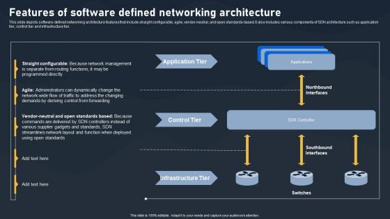 This slide depicts software-defined networking architecture features that include straight configurable, agile, vendor-neutral, and open standards-based. It also includes various components of SDN architecture such as application tier, control tier and infrastructure tier.Presenting this PowerPoint presentation, titled Features Of Software Defined Networking Architecture SDN Building Blocks Demonstration Pdf, with topics curated by our researchers after extensive research. This editable presentation is available for immediate download and provides attractive features when used. Download now and captivate your audience. Presenting this Features Of Software Defined Networking Architecture SDN Building Blocks Demonstration Pdf. Our researchers have carefully researched and created these slides with all aspects taken into consideration. This is a completely customizable Features Of Software Defined Networking Architecture SDN Building Blocks Demonstration Pdf that is available for immediate downloading. Download now and make an impact on your audience. Highlight the attractive features available with our PPTs. This slide depicts software defined networking architecture features that include straight configurable, agile, vendor neutral, and open standards based. It also includes various components of SDN architecture such as application tier, control tier and infrastructure tier.