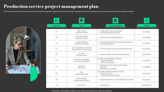 This slide presents a plan showing key tasks to be done for production support service project to timely completion of project. It includes key components like tasks, task description and status. Showcasing this set of slides titled Production Service Project Management Plan Guidelines Pdf The topics addressed in these templates are Task Description, Operations To Budget, Enhance Service All the content presented in this PPT design is completely editable. Download it and make adjustments in color, background, font etc. as per your unique business setting. This slide presents a plan showing key tasks to be done for production support service project to timely completion of project. It includes key components like tasks, task description and status.