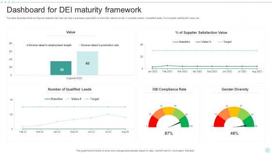 This slide illustrates facts and figures related to D and I that can help a business organization to track D and I maturity levels. It includes number of qualified leads, percent of supplier satisfaction value, etc. Pitch your topic with ease and precision using this Dashboard For DEI Maturity Framework Icons Pdf. This layout presents information on Dashboard For DEI, Maturity Framework, Supplier Satisfaction Value. It is also available for immediate download and adjustment. So, changes can be made in the color, design, graphics or any other component to create a unique layout. This slide illustrates facts and figures related to D and I that can help a business organization to track D and I maturity levels. It includes number of qualified leads, percent of supplier satisfaction value, etc.
