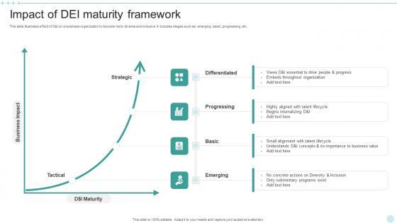 This slide illustrates effect of D and I on a business organization to become more diverse and inclusive. It includes stages such as emerging, basic, progressing, etc. Pitch your topic with ease and precision using this Impact Of DEI Maturity Framework Topics Pdf. This layout presents information on Progressing, Diversity And Inclusion, Talent Lifecycle. It is also available for immediate download and adjustment. So, changes can be made in the color, design, graphics or any other component to create a unique layout. This slide illustrates effect of D and I on a business organization to become more diverse and inclusive. It includes stages such as emerging, basic, progressing, etc.