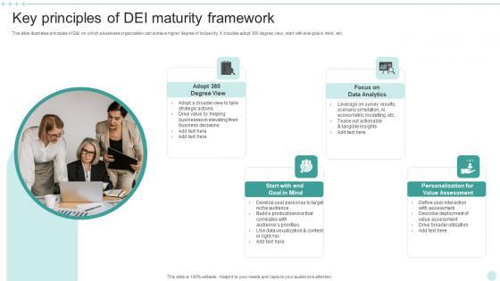 This slide illustrates principles of D and I on which a business organization can achieve higher degree of inclusivity. It includes adopt 360 degree view, start with end-goal in mind, etc. Showcasing this set of slides titled Key Principles Of DEI Maturity Framework Designs Pdf. The topics addressed in these templates are Focus On Data Analytics, Personalization For Value Assessment, DEI Maturity Framework. All the content presented in this PPT design is completely editable. Download it and make adjustments in color, background, font etc. as per your unique business setting. This slide illustrates principles of D and I on which a business organization can achieve higher degree of inclusivity. It includes adopt 360 degree view, start with end-goal in mind, etc.