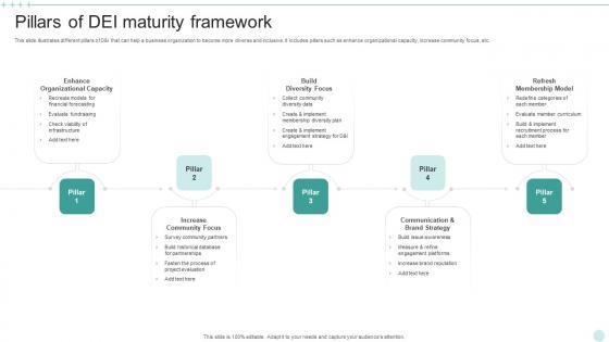 This slide illustrates different pillars of D and I that can help a business organization to become more diverse and inclusive. It includes pillars such as enhance organizational capacity, increase community focus, etc. Pitch your topic with ease and precision using this Pillars Of DEI Maturity Framework Sample Pdf. This layout presents information on Build Diversity Focus, Communication And Brand Strategy, Refresh Membership Model. It is also available for immediate download and adjustment. So, changes can be made in the color, design, graphics or any other component to create a unique layout. This slide illustrates different pillars of D and I that can help a business organization to become more diverse and inclusive. It includes pillars such as enhance organizational capacity, increase community focus, etc.
