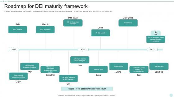 This slide illustrates timeline that can help a business organization to become more diverse and inclusive. It includes REIT seminar, REIT workshop, IT D and I summit, etc. Showcasing this set of slides titled Roadmap For DEI Maturity Framework Download Pdf. The topics addressed in these templates are Business Organization, Diverse And Inclusive, DEI Maturity Framework. All the content presented in this PPT design is completely editable. Download it and make adjustments in color, background, font etc. as per your unique business setting. This slide illustrates timeline that can help a business organization to become more diverse and inclusive. It includes REIT seminar, REIT workshop, IT D and I summit, etc.