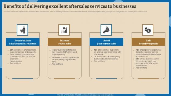 This slide covers the importance of excellent aftersales services, such as boosting customer satisfaction and retention, increasing repeat sales, gaining brand evangelists, and avoiding poor service costs. Boost your pitch with our creative Benefits Of Delivering Excellent Aftersales Services To Businesses Sample PDF. Deliver an awe inspiring pitch that will mesmerize everyone. Using these presentation templates you will surely catch everyones attention. You can browse the ppts collection on our website. We have researchers who are experts at creating the right content for the templates. So you do not have to invest time in any additional work. Just grab the template now and use them.