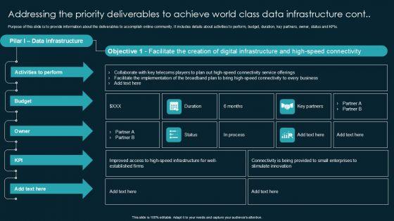 Mentioned slide provides information about the deliverables to accomplish world class data infrastructure. It includes details about activities to perform, budget, duration, key partners, owner, status and KPIs. Slidegeeks is one of the best resources for PowerPoint templates. You can download easily and regulate Addressing The Priority Deliverables To Achieve World Class Data Infrastructure Themes PDF for your personal presentations from our wonderful collection. A few clicks is all it takes to discover and get the most relevant and appropriate templates. Use our Templates to add a unique zing and appeal to your presentation and meetings. All the slides are easy to edit and you can use them even for advertisement purposes.