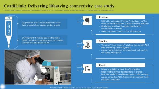 Following slide represents case study to improve health care sector by using IoT and automation. It includes elements such as overview, problem, solution and results. Welcome to our selection of the Cardilink Delivering Lifesaving Deploying IoT Solutions For Enhanced Healthcare Professional Pdf. These are designed to help you showcase your creativity and bring your sphere to life. Planning and Innovation are essential for any business that is just starting out. This collection contains the designs that you need for your everyday presentations. All of our PowerPoints are 100 percent editable, so you can customize them to suit your needs. This multi purpose template can be used in various situations. Grab these presentation templates today Following slide represents case study to improve health care sector by using IoT and automation. It includes elements such as overview, problem, solution and results.