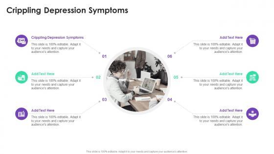 Presenting our innovatively-designed set of slides titled Crippling Depression Symptoms In Powerpoint And Google Slides Cpb. This completely editable PowerPoint graphic exhibits Crippling Depression Symptoms that will help you convey the message impactfully. It can be accessed with Google Slides and is available in both standard screen and widescreen aspect ratios. Apart from this, you can download this well-structured PowerPoint template design in different formats like PDF, JPG, and PNG. So, click the download button now to gain full access to this PPT design. Our Crippling Depression Symptoms In Powerpoint And Google Slides Cpb are topically designed to provide an attractive backdrop to any subject. Use them to look like a presentation pro.
