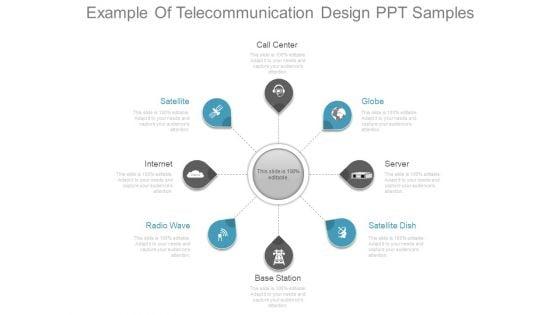 This is a example of telecommunication design ppt samples. This is a eight stage process. The stages in this process are call center, globe, server, satellite dish, base station, satellite, internet, radio wave