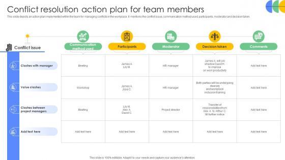 This slide depicts an action plan implemented within the team for managing conflicts in the workplace. It mentions the conflict issue, communication method used, participants, moderator and decision taken. Get a simple yet stunning designed Driving Results Designing A Team Conflict Resolution Action Plan For Team Members. It is the best one to establish the tone in your meetings. It is an excellent way to make your presentations highly effective. So, download this PPT today from Slidegeeks and see the positive impacts. Our easy-to-edit Driving Results Designing A Team Conflict Resolution Action Plan For Team Members can be your go-to option for all upcoming conferences and meetings. So, what are you waiting for Grab this template today. This slide depicts an action plan implemented within the team for managing conflicts in the workplace. It mentions the conflict issue, communication method used, participants, moderator and decision taken.