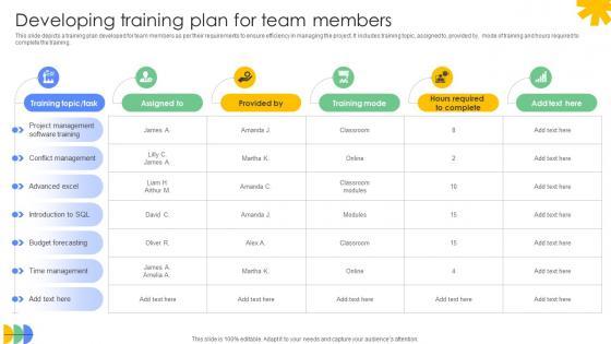 This slide depicts a training plan developed for team members as per their requirements to ensure efficiency in managing the project. It includes training topic, assigned to, provided by, mode of training and hours required to complete the training. From laying roadmaps to briefing everything in detail, our templates are perfect for you. You can set the stage with your presentation slides. All you have to do is download these easy-to-edit and customizable templates. Driving Results Designing A Team Developing Training Plan For Team Members will help you deliver an outstanding performance that everyone would remember and praise you for. Do download this presentation today. This slide depicts a training plan developed for team members as per their requirements to ensure efficiency in managing the project. It includes training topic, assigned to, provided by, mode of training and hours required to complete the training.