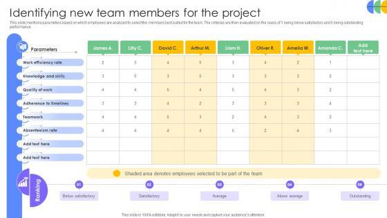 This slide mentions parameters based on which employees are analyzed to select the members best suited for the team. The criterias are then evaluated on the basis of 1 being below satisfactory and 5 being outstanding performance. If you are looking for a format to display your unique thoughts, then the professionally designed Driving Results Designing A Team Identifying New Team Members For The Project is the one for you. You can use it as a Google Slides template or a PowerPoint template. Incorporate impressive visuals, symbols, images, and other charts. Modify or reorganize the text boxes as you desire. Experiment with shade schemes and font pairings. Alter, share or cooperate with other people on your work. Download Driving Results Designing A Team Identifying New Team Members For The Project and find out how to give a successful presentation. Present a perfect display to your team and make your presentation unforgettable. This slide mentions parameters based on which employees are analyzed to select the members best suited for the team. The criterias are then evaluated on the basis of 1 being below satisfactory and 5 being outstanding performance.