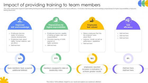 This slide mentions the impact of implementing training and development program within the team to improve efficiency. It includes improving skills and knowledge, preparedness for higher responsibilities, employees feeling valued and. Are you in need of a template that can accommodate all of your creative concepts This one is crafted professionally and can be altered to fit any style. Use it with Google Slides or PowerPoint. Include striking photographs, symbols, depictions, and other visuals. Fill, move around, or remove text boxes as desired. Test out color palettes and font mixtures. Edit and save your work, or work with colleagues. Download Driving Results Designing A Team Impact Of Providing Training To Team Members and observe how to make your presentation outstanding. Give an impeccable presentation to your group and make your presentation unforgettable. This slide mentions the impact of implementing training and development program within the team to improve efficiency. It includes improving skills and knowledge, preparedness for higher responsibilities, employees feeling valued and.