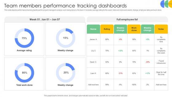 This slide depicts performance tracking dashboard for project manager to analyze work being done by the team. It includes average rating for the week, total work done and weekly change, employee rating and work done. This Driving Results Designing A Team Members Performance Tracking Dashboards is perfect for any presentation, be it in front of clients or colleagues. It is a versatile and stylish solution for organizing your meetings. The Driving Results Designing A Team Members Performance Tracking Dashboards features a modern design for your presentation meetings. The adjustable and customizable slides provide unlimited possibilities for acing up your presentation. Slidegeeks has done all the homework before launching the product for you. So, do not wait, grab the presentation templates today This slide depicts performance tracking dashboard for project manager to analyze work being done by the team. It includes average rating for the week, total work done and weekly change, employee rating and work done.