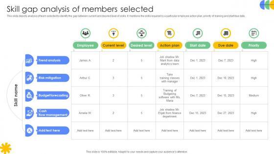 This slide depicts analysis of team selected to identify the gap between current and desired level of skills. It mentions the skills required by a particular employee action plan, priority of training and start or due date. Slidegeeks has constructed Driving Results Designing A Team Skill Gap Analysis Of Members Selected after conducting extensive research and examination. These presentation templates are constantly being generated and modified based on user preferences and critiques from editors. Here, you will find the most attractive templates for a range of purposes while taking into account ratings and remarks from users regarding the content. This is an excellent jumping-off point to explore our content and will give new users an insight into our top-notch PowerPoint Templates. This slide depicts analysis of team selected to identify the gap between current and desired level of skills. It mentions the skills required by a particular employee action plan, priority of training and start or due date.