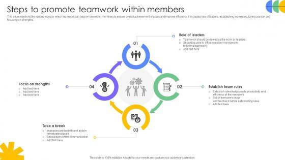 This slide mentions the various ways by which teamwork can be promote within members to ensure overall achievement of goals and improve efficiency. It includes role of leaders, establishing team rules, taking a break and focusing on strengths. This Driving Results Designing A Team Steps To Promote Teamwork Within Members from Slidegeeks makes it easy to present information on your topic with precision. It provides customization options, so you can make changes to the colors, design, graphics, or any other component to create a unique layout. It is also available for immediate download, so you can begin using it right away. Slidegeeks has done good research to ensure that you have everything you need to make your presentation stand out. Make a name out there for a brilliant performance. This slide mentions the various ways by which teamwork can be promote within members to ensure overall achievement of goals and improve efficiency. It includes role of leaders, establishing team rules, taking a break and focusing on strengths.
