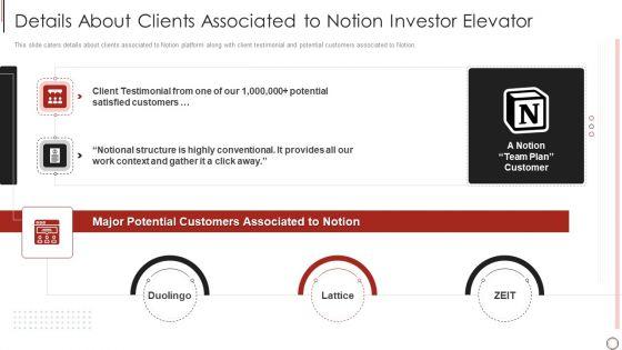 Details About Clients Associated To Notion Investor Elevator PowerPoint Presentation Templates and Google Slides