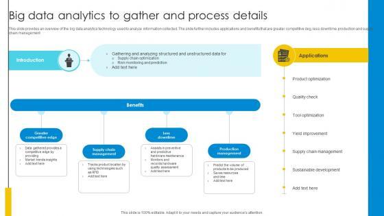 This slide provides an overview of the big data analytics technology used to analyze information collected. The slide further includes applications and benefits that are greater competitive deg, less downtime, production and supply chain management. If you are looking for a format to display your unique thoughts, then the professionally designed Big Data Analytics To Gather And Process Details Optimizing Inventory Management IoT SS V is the one for you. You can use it as a Google Slides template or a PowerPoint template. Incorporate impressive visuals, symbols, images, and other charts. Modify or reorganize the text boxes as you desire. Experiment with shade schemes and font pairings. Alter, share or cooperate with other people on your work. Download Big Data Analytics To Gather And Process Details Optimizing Inventory Management IoT SS V and find out how to give a successful presentation. Present a perfect display to your team and make your presentation unforgettable. This slide provides an overview of the big data analytics technology used to analyze information collected. The slide further includes applications and benefits that are greater competitive deg, less downtime, production and supply chain management.