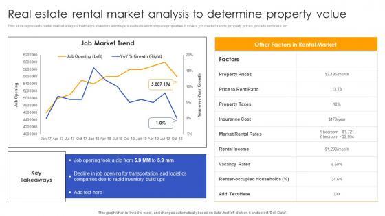 This slide represents rental market analysis that helps investors and buyers evaluate and compare properties. It covers job market trends, property prices, price to rent ratio etc. Whether you have daily or monthly meetings, a brilliant presentation is necessary. Real Estate Rental Market Analysis To Determine Effective Real Estate Flipping Approaches Microsoft Pdf can be your best option for delivering a presentation. Represent everything in detail using Real Estate Rental Market Analysis To Determine Effective Real Estate Flipping Approaches Microsoft Pdf and make yourself stand out in meetings. The template is versatile and follows a structure that will cater to your requirements. All the templates prepared by Slidegeeks are easy to download and edit. Our research experts have taken care of the corporate themes as well. So, give it a try and see the results. This slide represents rental market analysis that helps investors and buyers evaluate and compare properties. It covers job market trends, property prices, price to rent ratio etc.