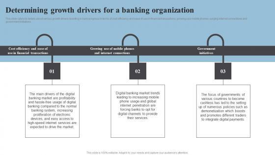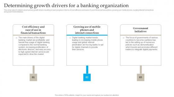 This slide caters to details about various growth drivers resulting in bank progress in terms of cost efficiency and ease of use in financial transactions, growing use mobile phones, surging internet connections and government initiatives. Boost your pitch with our creative Exploring The Banking Industry A Comprehensive Analysis Determining Growth Drivers For A Banking Organization Rules PDF. Deliver an awe-inspiring pitch that will mesmerize everyone. Using these presentation templates you will surely catch everyones attention. You can browse the ppts collection on our website. We have researchers who are experts at creating the right content for the templates. So you do not have to invest time in any additional work. Just grab the template now and use them.