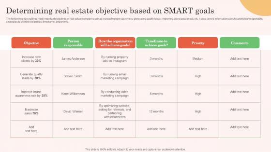 The following slide outlines most important objectives of real estate company such as increasing new customers, generating quality leads, improving brand awareness, etc. It also covers information about stakeholder responsible, strategies to achieve objectives, timeframe, and priority.Do you have an important presentation coming up Are you looking for something that will make your presentation stand out from the rest Look no further than Determining Real Estate Objective Based On SMART Goals Real Estate Property Marketing Graphics Pdf. With our professional designs, you can trust that your presentation will pop and make delivering it a smooth process. And with Slidegeeks, you can trust that your presentation will be unique and memorable. So why wait Grab Determining Real Estate Objective Based On SMART Goals Real Estate Property Marketing Graphics Pdf today and make your presentation stand out from the rest. The following slide outlines most important objectives of real estate company such as increasing new customers, generating quality leads, improving brand awareness, etc. It also covers information about stakeholder responsible, strategies to achieve objectives, timeframe, and priority.