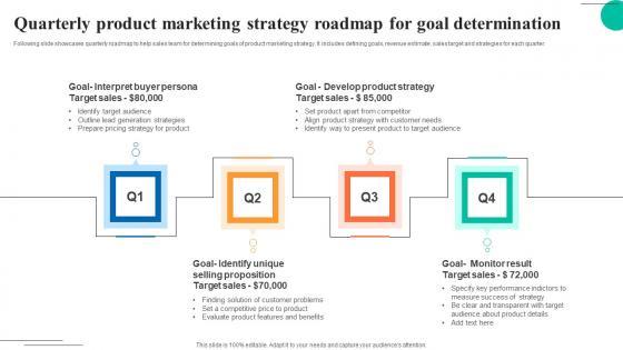 Following slide showcases quarterly roadmap to help sales team for determining goals of product marketing strategy. It includes defining goals, revenue estimate, sales target and strategies for each quarter. Showcasing this set of slides titled Quarterly Product Marketing Strategy Roadmap For Goal Determination Introduction Pdf. The topics addressed in these templates are Interpret Buyer Persona, Develop Product Strategy, Monitor Result. All the content presented in this PPT design is completely editable. Download it and make adjustments in color, background, font etc. as per your unique business setting. Following slide showcases quarterly roadmap to help sales team for determining goals of product marketing strategy. It includes defining goals, revenue estimate, sales target and strategies for each quarter.