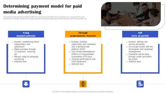 This slide provides glimpse about three different modes of payment which can be selected by an organization for paid advertising. It includes modes such as using manual contracts, through programmatic channels, self serve ad portals, etc. Whether you have daily or monthly meetings, a brilliant presentation is necessary. Determining Payment Model Comprehensive Guide For Paid Media Marketing Strategies Pictures Pdf can be your best option for delivering a presentation. Represent everything in detail using Determining Payment Model Comprehensive Guide For Paid Media Marketing Strategies Pictures Pdf and make yourself stand out in meetings. The template is versatile and follows a structure that will cater to your requirements. All the templates prepared by Slidegeeks are easy to download and edit. Our research experts have taken care of the corporate themes as well. So, give it a try and see the results. This slide provides glimpse about three different modes of payment which can be selected by an organization for paid advertising. It includes modes such as using manual contracts, through programmatic channels, self serve ad portals, etc.