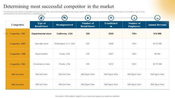 The following slide outlines comparative analysis to find out the most successful competitor in the retail industry. The slide covers relevant information about the types of competitors, type of store, headquartered, number of retail stores, established in, etc. Slidegeeks is here to make your presentations a breeze with Determining Most Successful Competitor In The Market Template PDF With our easy to use and customizable templates, you can focus on delivering your ideas rather than worrying about formatting. With a variety of designs to choose from, you are sure to find one that suits your needs. And with animations and unique photos, illustrations, and fonts, you can make your presentation pop. So whether you are giving a sales pitch or presenting to the board, make sure to check out Slidegeeks first.