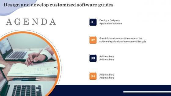 Find a pre designed and impeccable Agenda Design And Develop Customized Software Guides Structure Pdf. The templates can ace your presentation without additional effort. You can download these easy to edit presentation templates to make your presentation stand out from others. So, what are you waiting for Download the template from Slidegeeks today and give a unique touch to your presentation. Our Agenda Design And Develop Customized Software Guides Structure Pdf are topically designed to provide an attractive backdrop to any subject. Use them to look like a presentation pro.