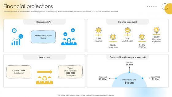 This slide provides an overview of the financial projections for the company. It showcases monthly active users, headcount, cash position and income statement. Present like a pro with Financial Projections Software Development Company Funding Elevator Pitch Deck. Create beautiful presentations together with your team, using our easy-to-use presentation slides. Share your ideas in real-time and make changes on the fly by downloading our templates. So whether you are in the office, on the go, or in a remote location, you can stay in sync with your team and present your ideas with confidence. With Slidegeeks presentation got a whole lot easier. Grab these presentations today. This slide provides an overview of the financial projections for the company. It showcases monthly active users, headcount, cash position and income statement.