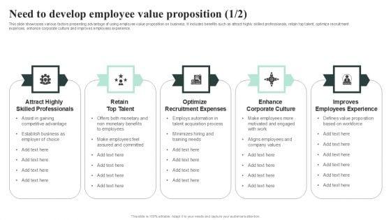This slide showcases various factors presenting advantage of using employee value proposition on business. It includes benefits such as attract highly skilled professionals, retain top talent, optimize recruitment expenses, enhance corporate culture and improves employees experience. Slidegeeks has constructed Need To Develop Employee Value Proposition Ppt Icon Pictures PDF after conducting extensive research and examination. These presentation templates are constantly being generated and modified based on user preferences and critiques from editors. Here, you will find the most attractive templates for a range of purposes while taking into account ratings and remarks from users regarding the content. This is an excellent jumping off point to explore our content and will give new users an insight into our top notch PowerPoint Templates.