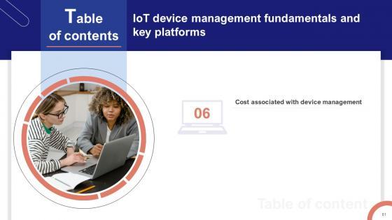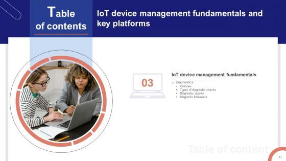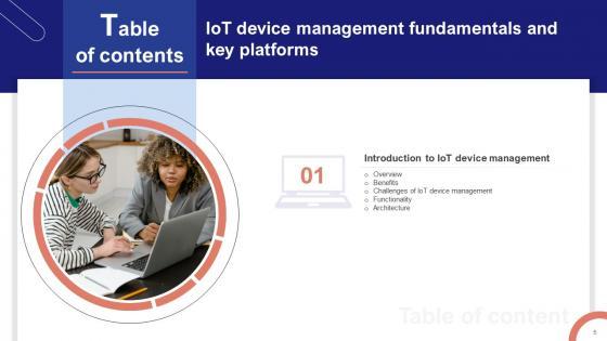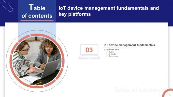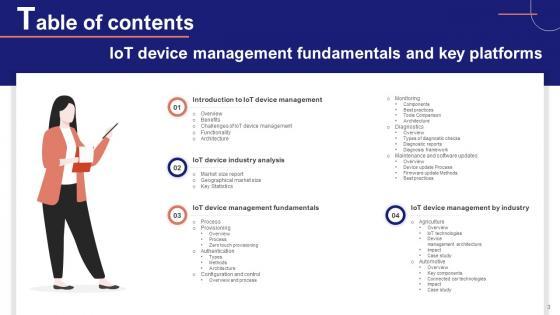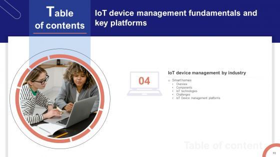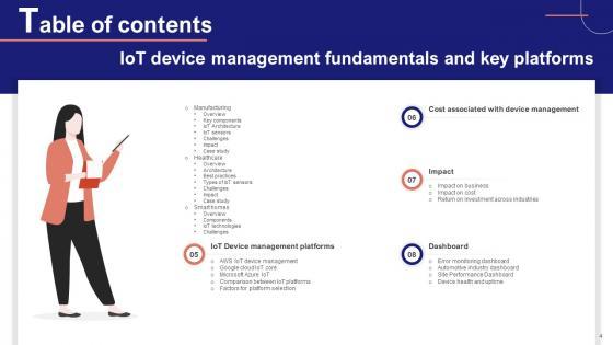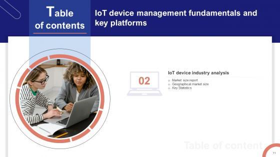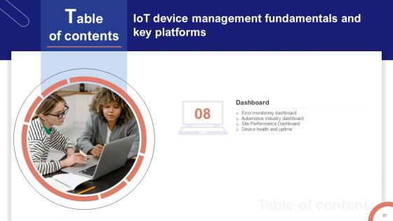 Take your projects to the next level with our ultimate collection of Table Of Contents IoT Device Management Fundamentals And Key Platforms IoT SS V. Slidegeeks has designed a range of layouts that are perfect for representing task or activity duration, keeping track of all your deadlines at a glance. Tailor these designs to your exact needs and give them a truly corporate look with your own brand colors they will make your projects stand out from the rest Our Table Of Contents IoT Device Management Fundamentals And Key Platforms IoT Ss V are topically designed to provide an attractive backdrop to any subject. Use them to look like a presentation pro.