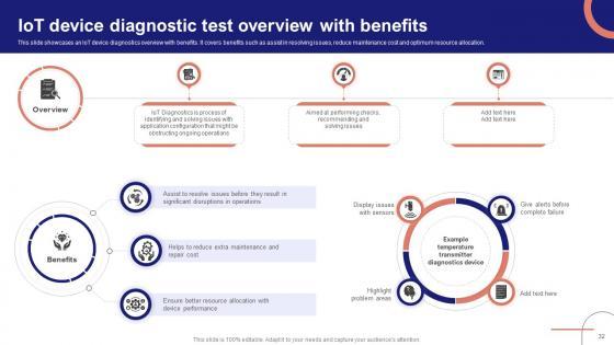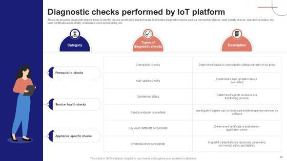 This slide provides diagnostic checks types to identify issues and block security threats. It includes diagnostic checks such as connectivity checks, auto update checks, operational status, key vault certificate accessibility, credentials store accessibility, etc. Crafting an eye-catching presentation has never been more straightforward. Let your presentation shine with this tasteful yet straightforward IoT Device Management Fundamentals Diagnostic Checks Performed By IoT Platform IoT SS V template. It offers a minimalistic and classy look that is great for making a statement. The colors have been employed intelligently to add a bit of playfulness while still remaining professional. Construct the ideal IoT Device Management Fundamentals Diagnostic Checks Performed By IoT Platform IoT SS V that effortlessly grabs the attention of your audience Begin now and be certain to wow your customers This slide provides diagnostic checks types to identify issues and block security threats. It includes diagnostic checks such as connectivity checks, auto update checks, operational status, key vault certificate accessibility, credentials store accessibility, etc.