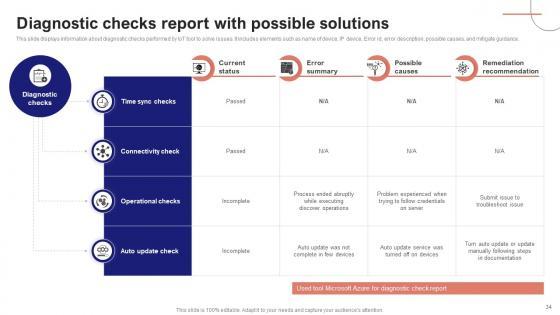 This slide provides diagnostic checks types to identify issues and block security threats. It includes diagnostic checks such as connectivity checks, auto update checks, operational status, key vault certificate accessibility, credentials store accessibility, etc. Are you in need of a template that can accommodate all of your creative concepts This one is crafted professionally and can be altered to fit any style. Use it with Google Slides or PowerPoint. Include striking photographs, symbols, depictions, and other visuals. Fill, move around, or remove text boxes as desired. Test out color palettes and font mixtures. Edit and save your work, or work with colleagues. Download Diagnostic Checks Performed By Iot Platform Iot Device Management Topics Pdf and observe how to make your presentation outstanding. Give an impeccable presentation to your group and make your presentation unforgettable. This slide provides diagnostic checks types to identify issues and block security threats. It includes diagnostic checks such as connectivity checks, auto update checks, operational status, key vault certificate accessibility, credentials store accessibility, etc.