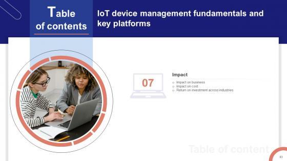 This Table Of Contents For IoT Device Management Fundamentals And Key Platforms IoT SS V from Slidegeeks makes it easy to present information on your topic with precision. It provides customization options, so you can make changes to the colors, design, graphics, or any other component to create a unique layout. It is also available for immediate download, so you can begin using it right away. Slidegeeks has done good research to ensure that you have everything you need to make your presentation stand out. Make a name out there for a brilliant performance. Our Table Of Contents For IoT Device Management Fundamentals And Key Platforms IoT Ss V are topically designed to provide an attractive backdrop to any subject. Use them to look like a presentation pro.