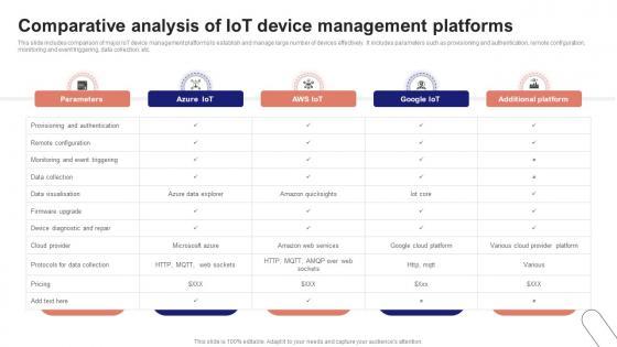 This slide includes comparison of major IoT device management platforms to establish and manage large number of devices effectively. It includes parameters such as provisioning and authentication, remote configuration, monitoring and event triggering, data collection, etc. If your project calls for a presentation, then Slidegeeks is your go-to partner because we have professionally designed, easy-to-edit templates that are perfect for any presentation. After downloading, you can easily edit IoT Device Management Fundamentals Comparative Analysis Of IoT Device Management Platforms IoT SS V and make the changes accordingly. You can rearrange slides or fill them with different images. Check out all the handy templates This slide includes comparison of major IoT device management platforms to establish and manage large number of devices effectively. It includes parameters such as provisioning and authentication, remote configuration, monitoring and event triggering, data collection, etc.