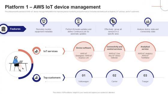 This slide presents overview of AWS IoT device management platform for improving device monitoring and performance. It includes elements such as features, IoT services, and IoT customers. Here you can discover an assortment of the finest PowerPoint and Google Slides templates. With these templates, you can create presentations for a variety of purposes while simultaneously providing your audience with an eye-catching visual experience. Download IoT Device Management Fundamentals Platform 1 Aws IoT Device Management IoT SS V to deliver an impeccable presentation. These templates will make your job of preparing presentations much quicker, yet still, maintain a high level of quality. Slidegeeks has experienced researchers who prepare these templates and write high-quality content for you. Later on, you can personalize the content by editing the IoT Device Management Fundamentals Platform 1 Aws IoT Device Management IoT SS V. This slide presents overview of AWS IoT device management platform for improving device monitoring and performance. It includes elements such as features, IoT services, and IoT customers.