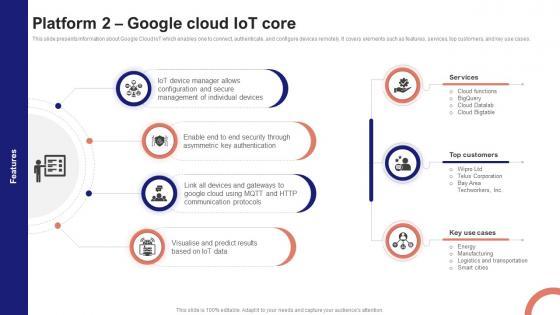 This slide presents information about Google Cloud IoT which enables one to connect, authenticate, and configure devices remotely. It covers elements such as features, services, top customers, and key use cases. This IoT Device Management Fundamentals Platform 2 Google Cloud IoT Core IoT SS V from Slidegeeks makes it easy to present information on your topic with precision. It provides customization options, so you can make changes to the colors, design, graphics, or any other component to create a unique layout. It is also available for immediate download, so you can begin using it right away. Slidegeeks has done good research to ensure that you have everything you need to make your presentation stand out. Make a name out there for a brilliant performance. This slide presents information about Google Cloud IoT which enables one to connect, authenticate, and configure devices remotely. It covers elements such as features, services, top customers, and key use cases.