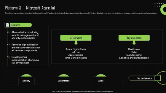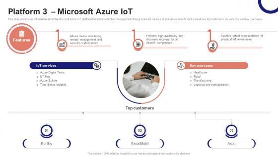 This slide showcases information about the Microsoft Azure IoT platform that allows effective management of large scale IoT devices. It includes elements such as features, top customers, top services, and key use cases. Formulating a presentation can take up a lot of effort and time, so the content and message should always be the primary focus. The visuals of the PowerPoint can enhance the presenters message, so our Platform 3 Microsoft Azure Iot Device Management Themes Pdf was created to help save time. Instead of worrying about the design, the presenter can concentrate on the message while our designers work on creating the ideal templates for whatever situation is needed. Slidegeeks has experts for everything from amazing designs to valuable content, we have put everything into Platform 3 Microsoft Azure Iot Device Management Themes Pdf This slide showcases information about the Microsoft Azure IoT platform that allows effective management of large scale IoT devices. It includes elements such as features, top customers, top services, and key use cases.